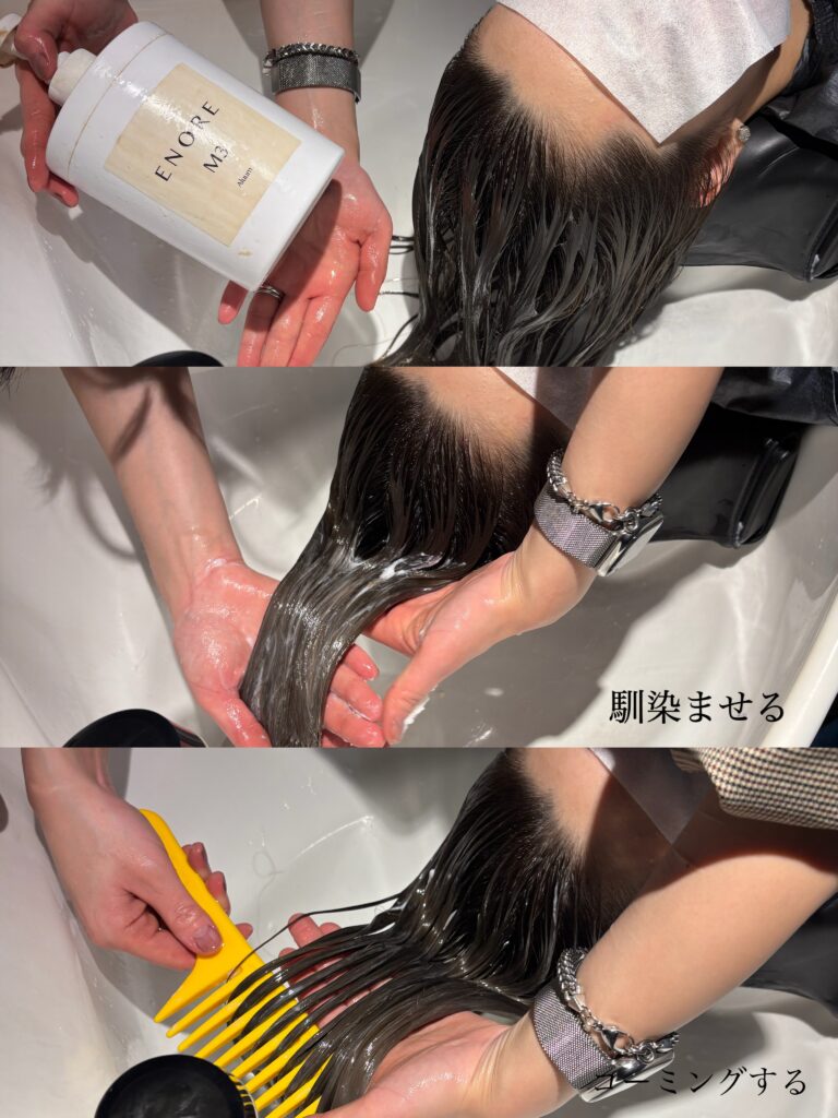 ENORE PHコントロールトリートメントをシャンプー代で揉み込み、洗い流します。