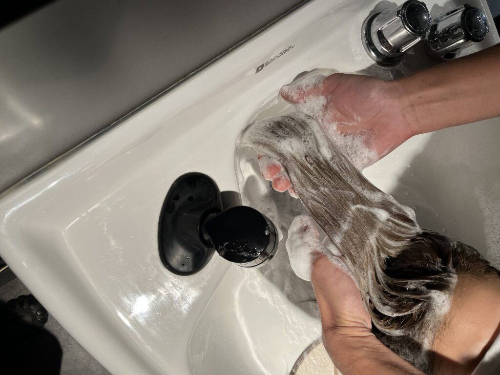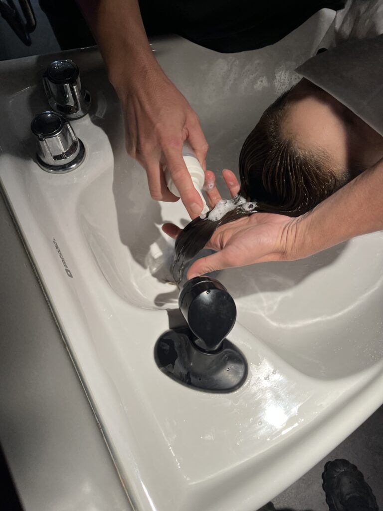 しっかりとすすぎ終わったら、専用のシャンプーで泡立てをしてマッサージをしながら洗っていきます。