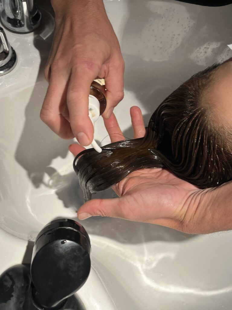 ②一つ目のトリートメントを塗布、ケラチンタンパク質を補充