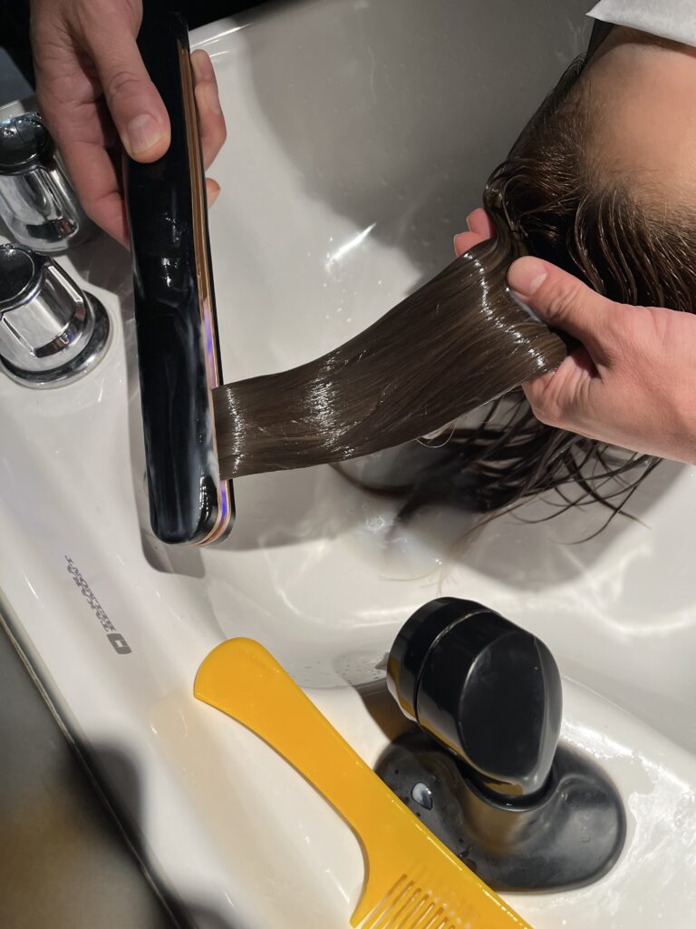 ⑦4つ目のトリートメントを塗布、疏水反応(二種類のキューティクル補修)