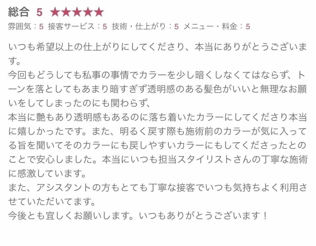 これから髪質を改善していくため、ホームケアの仕方や染める頻度などもお話させていただきました。