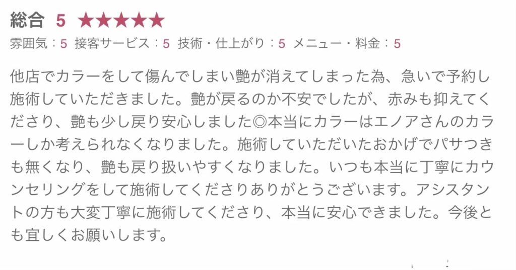 他店でリタッチだけで我慢していたお客様も、ENOREに通うと毎回全体を染めて髪色を楽しむ事ができます。