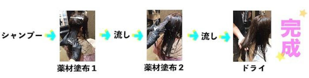 それに対してストレートパーマはストレートアイロンを使わず、すぐに2つ目の薬剤を塗り固定していくんです。