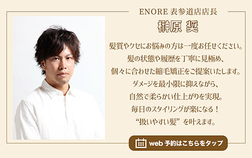 縮毛矯正と髪質改善が得意な美容院ENORE(エノア)表参道店榊原です。