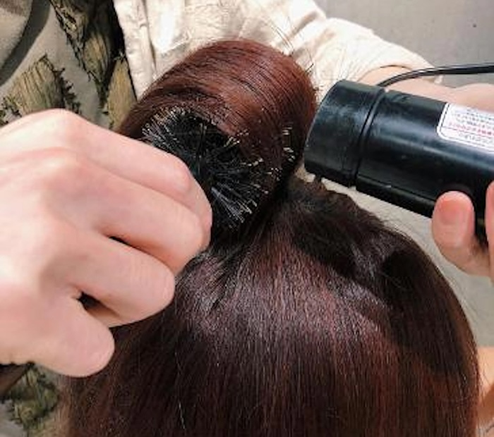 (写真ではロールブラシを使っていますが、セルフだと難しいのでカーラーを使ってあげるとやりやすいんです!)
