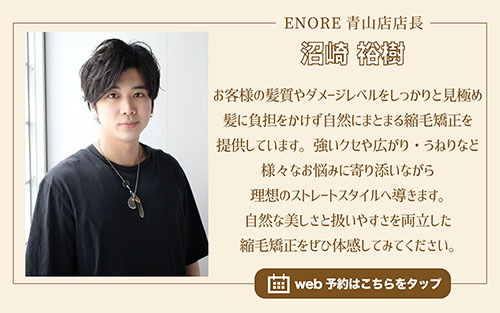 こんにちは。縮毛矯正が得意な美容院ENORE(エノア)青山店店長沼崎です。