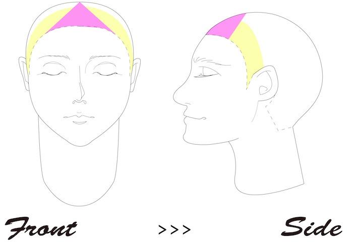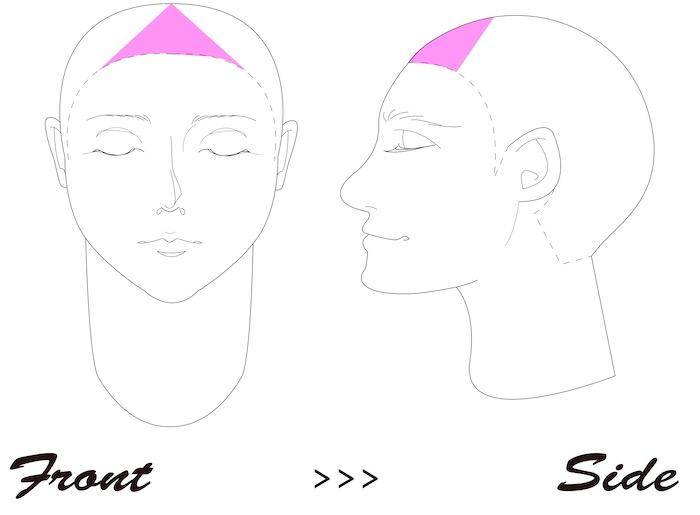 奥行き(指3本分くらい〜つむじ)と 左右の幅(黒目外側〜目尻上のライン)の3つのポイントを結んだ、ピンクの三角形が前髪縮毛矯正の範囲になります。