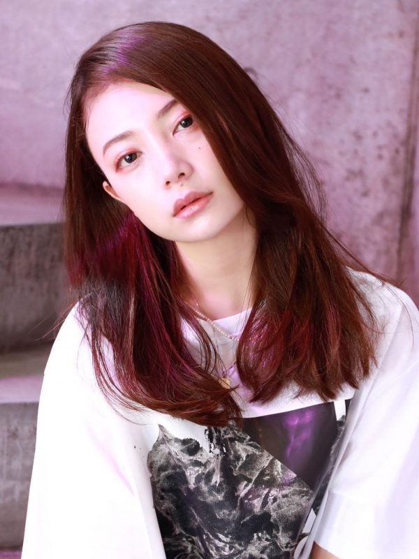 少し個性的なレッドブラウンカラーをスパイスにしたかっこいいセミロングスタイル。縮毛矯正をするとなかなか発色の良い派手な髪色が難しくなりますが、赤はブリーチなしでも発色がとても良いのが特徴。髪色にインパクトを出したい方は是非お試しください!
