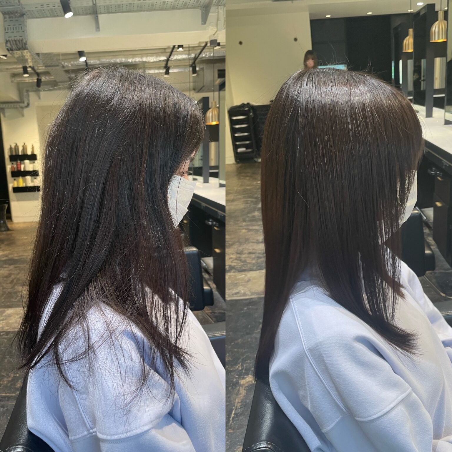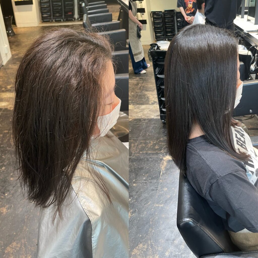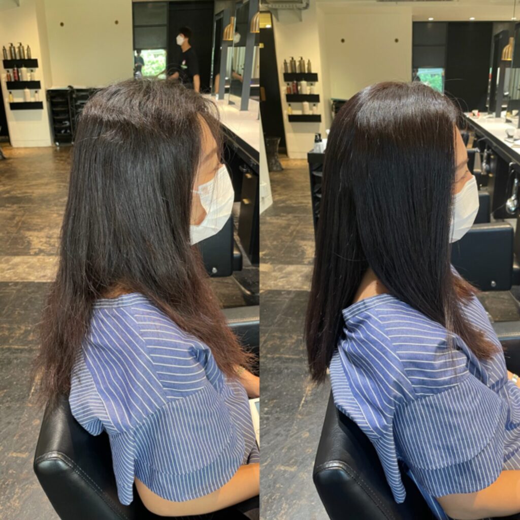 根元のリタッチ縮毛矯正と毛先のカット&トリートメントでの毛髪補修を行いました。根元のくせ毛と毛先がしっかりと整ったのでかなりまとまりと艶がアップしましたよね!