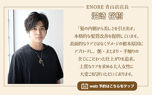 こんにちは。髪質改善が得意な美容院ENORE(エノア)青山店沼崎です。