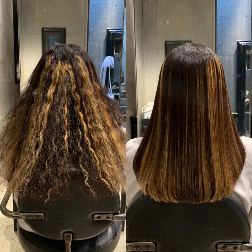 バレイヤージュなどのデザインカラー、酸熱トリートメント、縮毛矯正など様々な履歴が残っている髪の場合、根元・毛先・中間だけではなく襟足ハチ上など部分によって髪の状態が大きく違い、さらに過剰なダメージを受けていて縮毛矯正で髪を真っ直ぐに伸ばす事自体が難しい場合もあります。