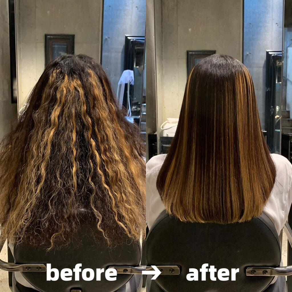 クセが強いと薬剤の浸透時間が長くなったり、アイロンにかける時間が基本的に長くなります。薬剤設定、薬剤の放置時間、アイロンの伸ばし具合をどうするかは担当の美容師さんが髪の状態を見ての判断になりますが、クセが強い方は戻りやすいですししっかり伸ばす必要があります。だからと言って髪に負担をかけ過ぎてしまうと過度なダメージやビビリ毛の原因になってしまうので、施術のバランス感覚やアプローチがとても重要になるんですね。